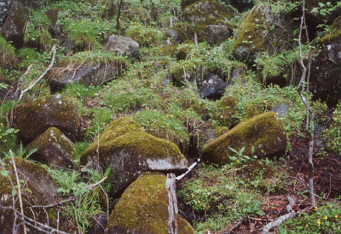 高山の山中の林間にひっそりと咲いていたキバナノコマノツメですが、林道の開通により林内照度(日当たり)が改善されたため大きな群落をつくったと思われます。