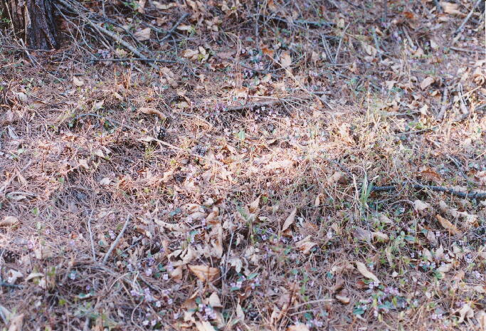 韮崎市のアカマツ林の中に約200u(10m×20m)の広さに咲いていたマキノスミレです。