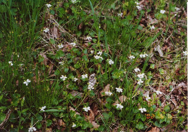 高遠高原の湖畔に咲いていたシラユキスミレの群落です。
