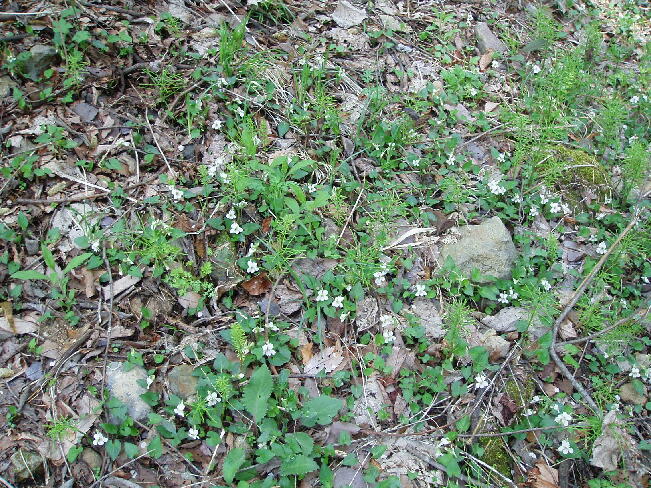 長野県の長門町から和田村に越える峠にあるヒカゲスミレの群落です。道路沿いに約30mにわたって咲いていました。周辺の樹木が適度な日陰をつくりだしていて安定した状態で生育しています。車に乗ったまま撮影ができます。